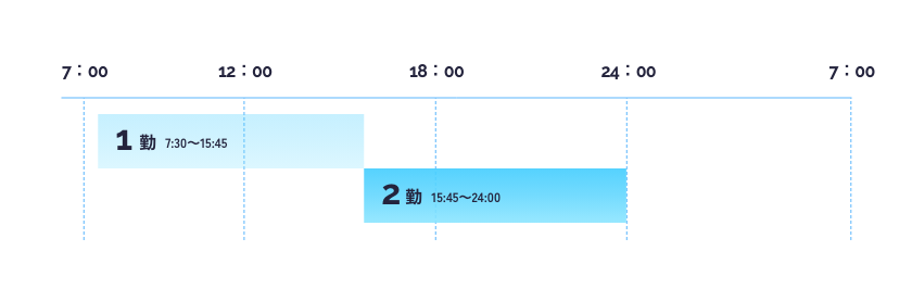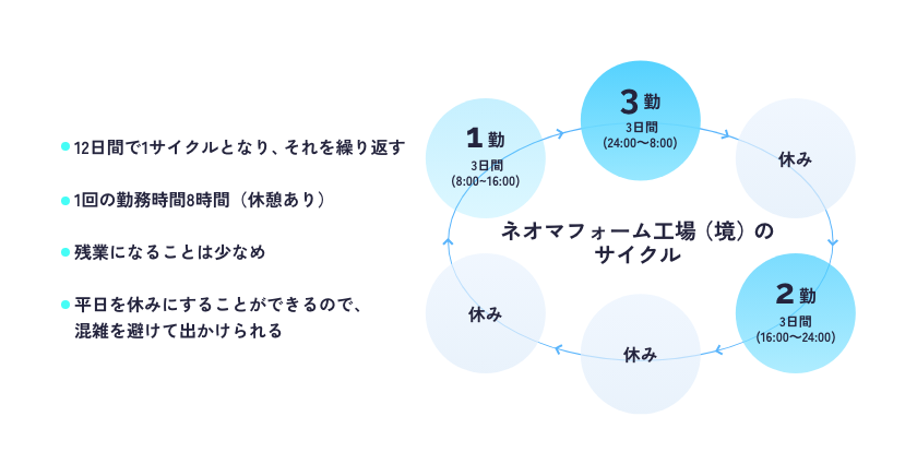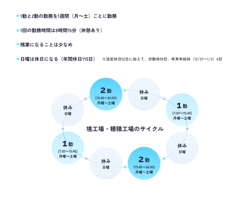 交代勤務とは、1日の勤務時間を複数に分けて交代で働くことで、工場を24時間365日稼働させるための勤務形態です。地区によって2交代や3交代の勤務体制を組み、工場の稼働を維持しています。境工場と穂積工場では2組2交代勤務と4組3交代勤務を採用しています。2組2交代は1週間ごとに日勤と夜勤を変えて勤務し、日曜が定休になっています。4組3交代は1サイクルは12日間で、1日あたりの勤務時間は8時間(休憩あり)です。残業になることは少なめで、平日が休みになることも多く、混雑を避けて出かけることができます。