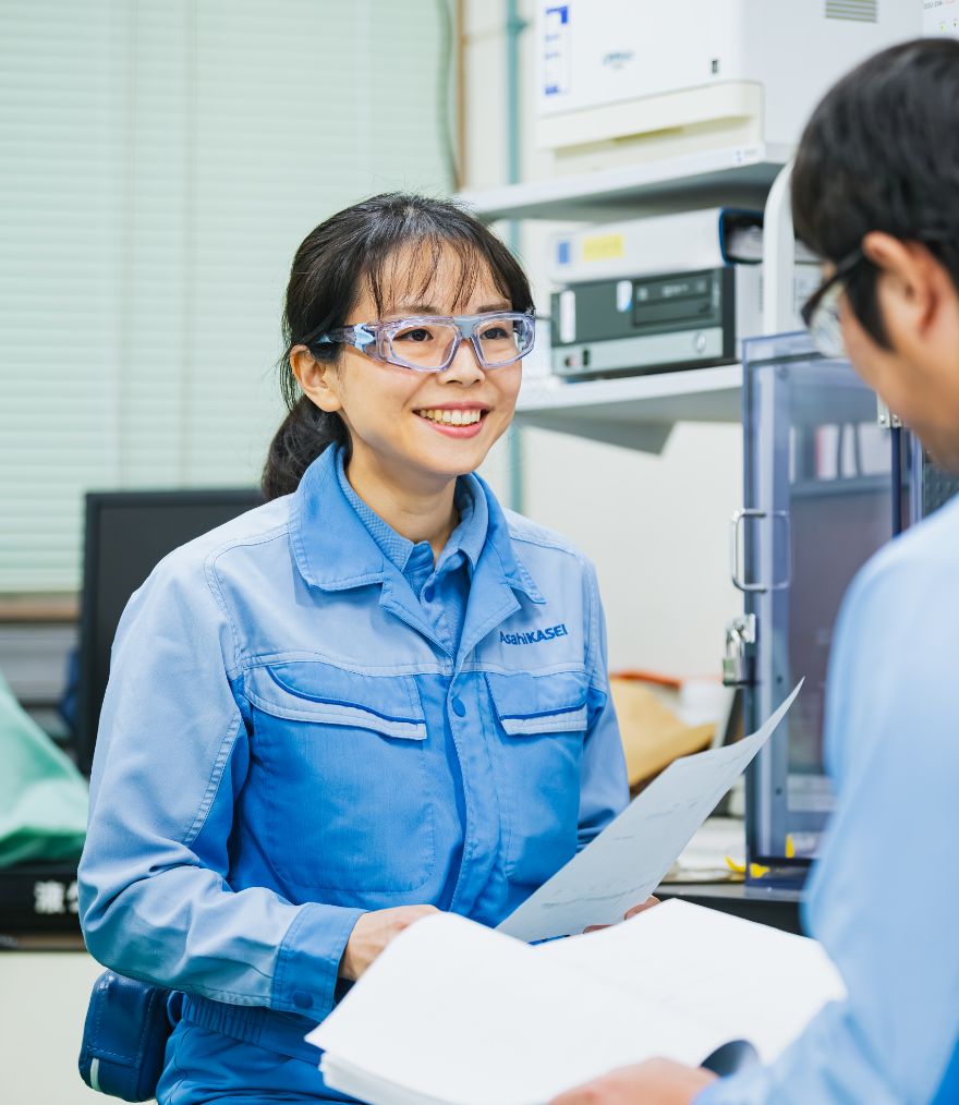 「部署には30年前の事例まで覚えている大先輩がいて、よく相談に乗っていただいています。まさに生き字引のような存在で、その支えがとても心強いんです。こうした人がそばにいることも、旭化成の大きな魅力だと感じています」