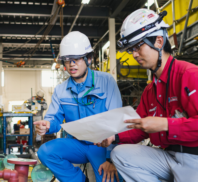 私が担当している重合エリアの中でも、冷水塔と呼ばれる設備は特に老朽化が進んでいました。私が現在の部署に異動する前から補修には着手されていたものの、なかなか想定通りには進まず、課題が残っていたのです。そこで私は現状を徹底的に把握し、効率的かつ経済的に設備の更新ができる、新たな計画を立て直しました。一般的には保全は「トラブル対応」というイメージが強いかもしれませんが、私が大切にしているのは、トラブルが起きないように先手を打って対策を進めていく“攻めの保全”です。入社以来、長く設計業務に携わってきた経験から、設備の本来のあるべき姿を理解していることが私の強みです。その強みを活かすことで、積極的に“攻めの保全”を推進していきたいと考えています。
